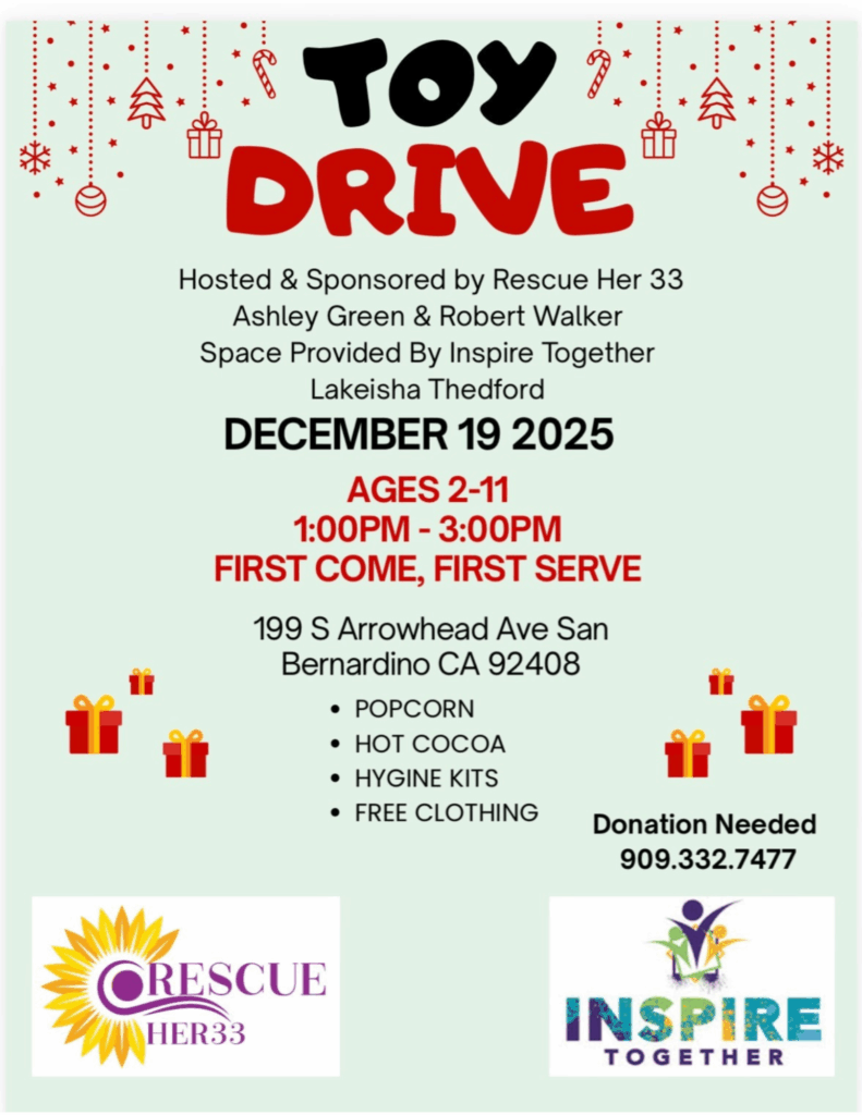 We are accepting all donation to help with the toy drive. Please drop off at 320 North E. Street. San Bernardino, CA. 92401. We are accepting donation from 12/1/25 through 12/17/2025 from 9am, 5 pm. Please call 951.347.9217 or 770.256.6104